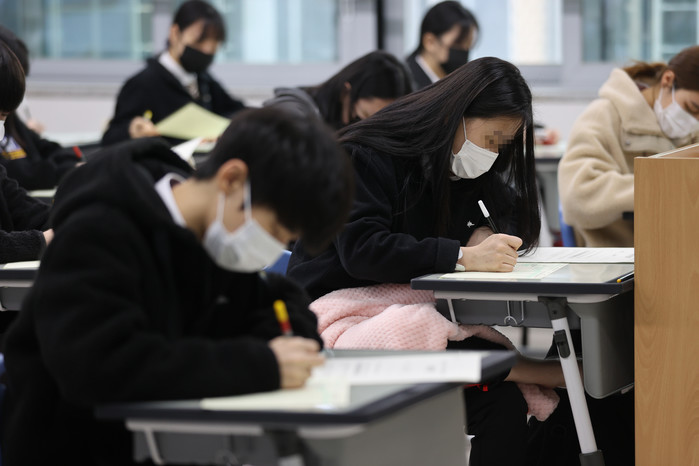 고등학교 2학년이 전국연합학력평가를 치르는 날인 24일 오전 서울 강서구 공항고등학교 학생들이 문제를 풀고 있다. 올해부터 달라지는 대학수학능력시험(수능) 체제에 맞춘 첫 고등학교 전국연합학력평가는 전날부터 25일까지 진행되며 23일에 1학년, 24일 2학년, 25일 3학년으로 분산 시행된다.
