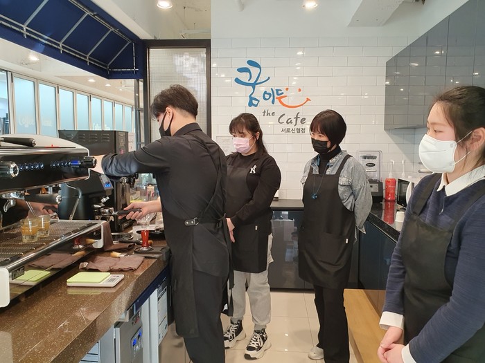 인천서구지역자활센터에서 운영하는 ‘청년자립도전사업단’의 ‘꿈이든더카페’ 참여자를 대상으로 지난 2일부터 ‘노유민 코페’ 대표이자 그룹 NRG의 노유민씨가 재능기부에 나섰다. 사진은 이날 노씨가 바리스타 교육을 진행하고 있는 모습. (사진제공=서구청)