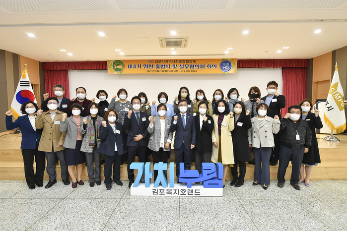 경기 김포시가 최근 시청에서 지역사회복지를 이끌어 갈 제4기 지역사회보장 대표 및 실무 협의체에 대한 출범식을 열고, 본격 활동에 들어갔다. 이번 제4기 김포시 지역사회보장협의체는 총 307명이 구성됐다. 사진은 기념촬영을 하고 있는 관계자들의 모습. (사진제공=김포시청)