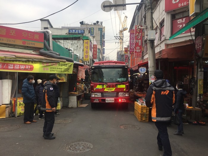 경기 의정부시 흥선권역은 최근 제일시장 소방차량 출동로 확보를 위해 의정부 소방서와 합동점검을 했다. 이날 합동점검반은 노상적치물을 자진 정비하도록 계고·안내하고 긴급차량 통행로 확보 훈련을 진행했다. 사진은 합동점검반이 긴급차량 통행로 확보 훈련을 하고 있는 모습. (사진제공=의정부시청)