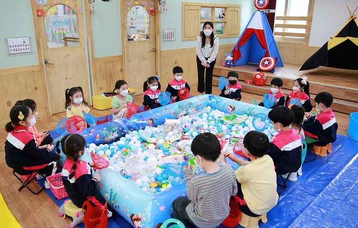 경기 수원시 장안구가 오는 6월4일까지 환경보호 인식 형성을 위한 ‘분리는 끼리끼리’ 체험교육을 어린이집별로 추진한다. 사진은 영화동 아이린어린이집 원아들이 17~18일 바다에 버려진 쓰레기를 뜰채로 건져내 종류별로 분리하고 깨끗하게 정리해보는 체험활동을 하는 모습. (사진제공=장안구청)