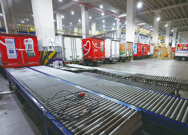 27일 오전 서울 송파구 서울복합물류센터에서 롯데택배 전국 파업출정식이 열렸다. 물류센터 내부가 한산하다.