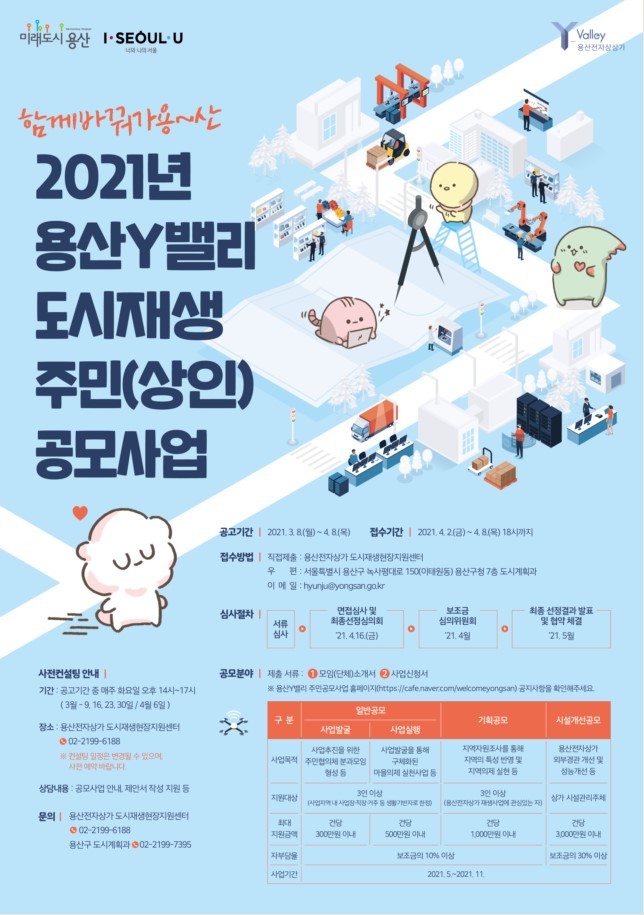 [시민일보 = 홍덕표 기자] 용산구(구청장 성장현)가 지역 경제, 공동체 활성화를 위해 오는 5월부터 11월까지 7개월간 '2021년 Y밸리(용산전자상가) 도시재생 주민(상인) 공모사업'을 추진한다.