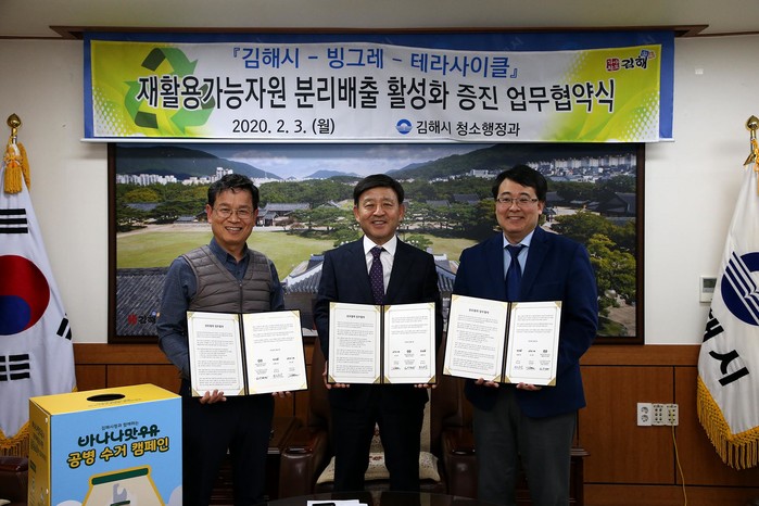 김해시는 3일 오후 3시 시장실에서 ㈜빙그레, 테라사이클코리아와 재활용자원 분리배출 활성화 업무협약을 체결하고 ‘분바스틱 캠페인’을 진행한다고 밝혔다
