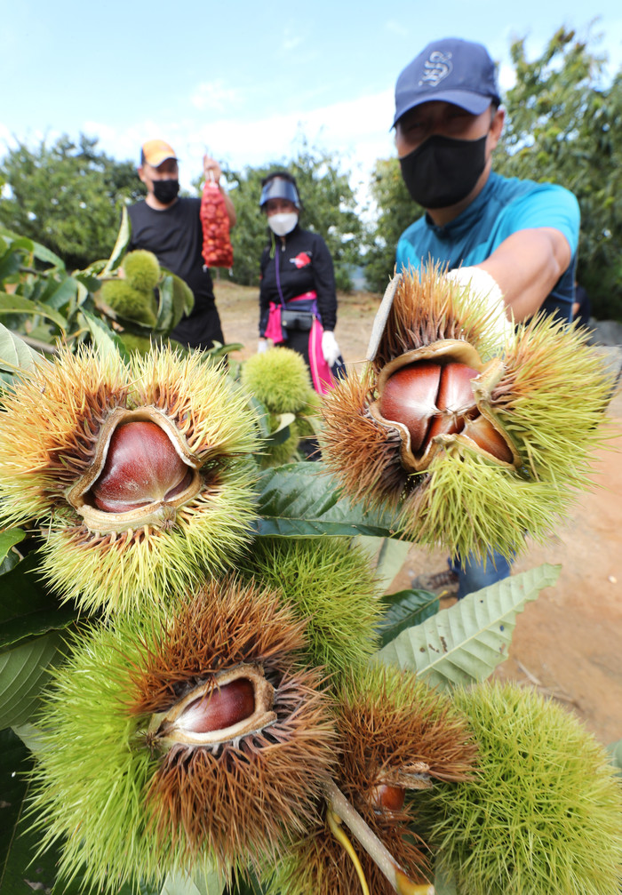 9일 오전 추석 명절을 앞두고 햇밤 수확 작업이 한창인 충남 공주시 반포면에 있는 말재농원에서 농장주가 쩍 벌어진 튼실한 햇밤을 들어 보이고 있다.