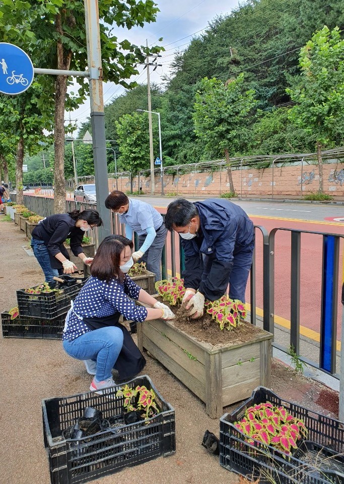 경기 안산시 상록구 성포동행정복지센터가 최근 지역내에 있는 도로변 화단 50여곳에 일일초 등 가을꽃 2500본을 심었다. 가을꽃 식재는 코로나19에 지친 지역주민들을 위로하고, 지역내 환경정비를 하고자 진행됐다. 사진은 센터 직원들이 도로변 화단에 가을꽃을 심고 있는 모습.(사진제공=안산시청)
