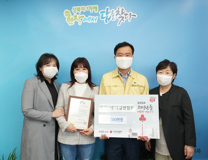 서울 성북구 민간어린이집연합회가 31일 코로나19로 생계를 위협받고 있는 자영업자나 어려운 가구 지원을 위해 성북구에 성금 700만원을 전달했다. 사진은 성금을 전달받은 이승로 구청장(왼쪽에서 두 번째)이 연합회 관계자들과 기념촬영을 하는 모습. (사진제공=성북구청)