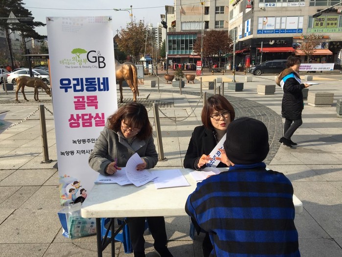 경기 의정부시 녹양동 맞춤형복지팀과 동지역사회보장협의체는 지역 주민들의 애로사항을 듣고, 다양한 복지욕구를 해결하기 위해 21일 녹양역 앞에서 '우리동네 골목 상담반'을 운영했다. 사진은 상담사가 주민과 상담을 하고 있는 모습.(사진제공=의정부시청)