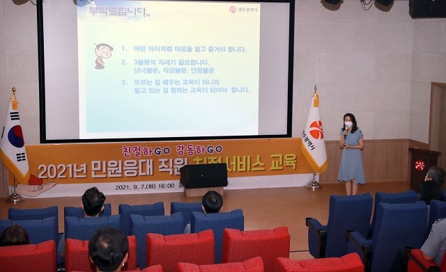 이날 교육은 광주여대 김문경 교수가 ‘사람의 마음을 끌어당기는 대화기법’이라는 주제로 민원실 직원 등이 시민의 목소리를 경청하고 눈높이에 맞춰 공감하는 자세와 위드 코로나 시대에 맞는 민원응대 요령, 대처법 등을 강연했다.