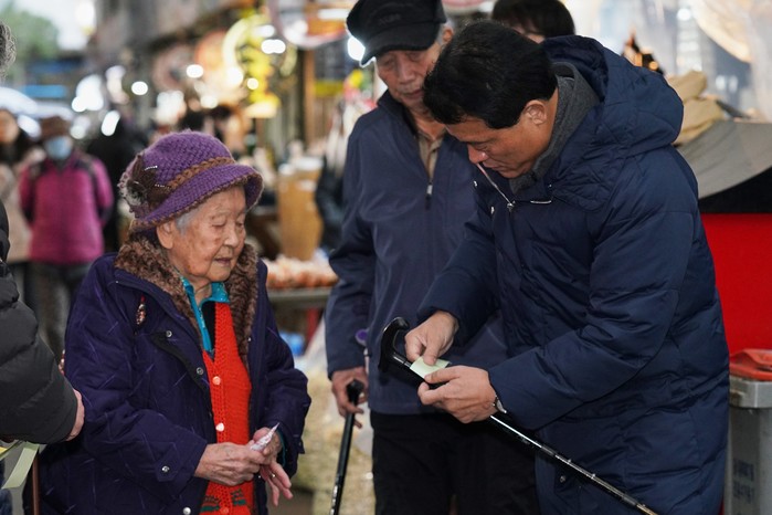 서울 성북구가 노인 등의 교통약자를 위한 안전보행 환경 조성을 위해 최근 돈암시장을 방문해 노인들의 지팡이와 보행기에 형광테이프를 붙여주는 캠페인을 펼쳤다. 사진은 이승로 구청장이 시장을 찾은 노인의 지팡이에 형광테이프를 붙여주며 안전을 당부하는 모습. (사진제공=성북구청)