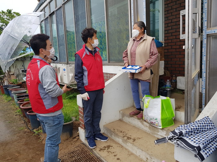 충남 아산시 인주면 행복키움추진단은 최근 가정의 달을 맞아 저소득층 홀몸노인 30여가구를 방문해 화장품세트·바나나 등 후원물품을 전달했다. 사진은 행복키움추진단원들이 홀몸노인 가구를 방문해 후원물품을 전달하고 있는 모습. (사진제공=아산시청)