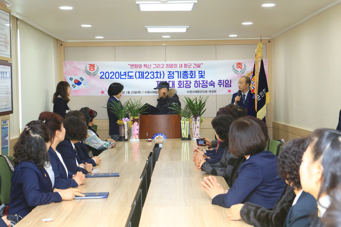 경기 수원시 재향군인회 여성회는 최근 향군빌딩 대회의실에서 제9대 하정숙 회장을 비롯한 역대 회장단과 대의원 등 50여명이 참석한 가운데 2020년 제23차 정기총회를 개최하고, 팔달구 매산동에 거주하고 있는 조손가정에 장학금 30만원을 전달했다. 사진은 장학금을 전달하고 있는 모습. (사진제공=팔달구청)
