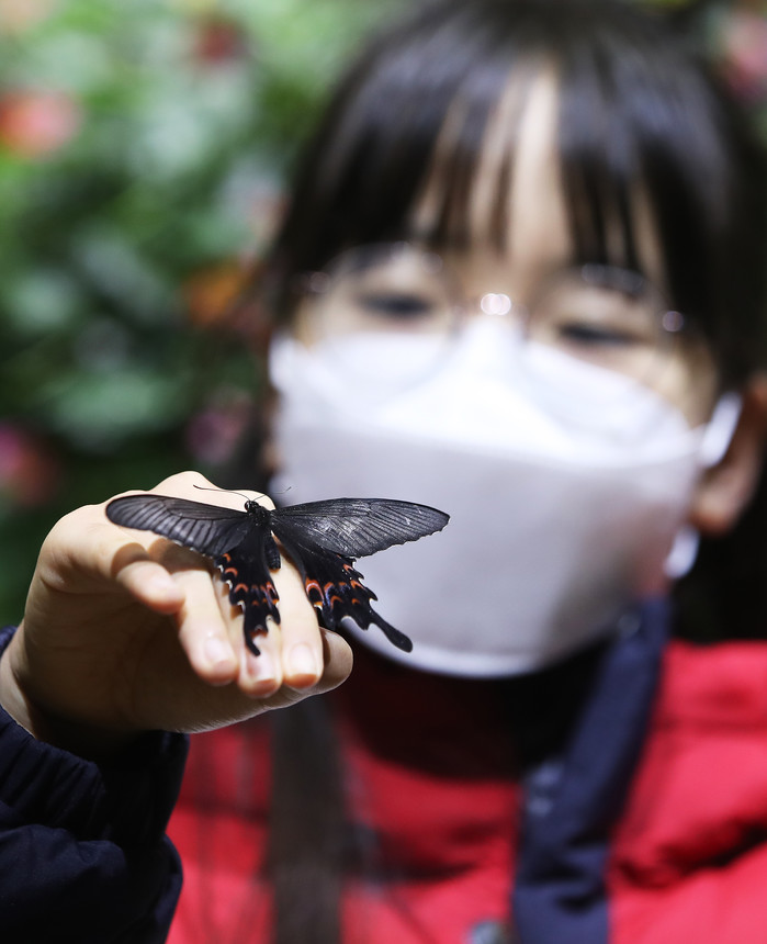절기상 대한(大寒)인 20일 오전 경기 용인시 에버랜드 나비정원을 찾은 어린이가 나비를 바라보고 있다.