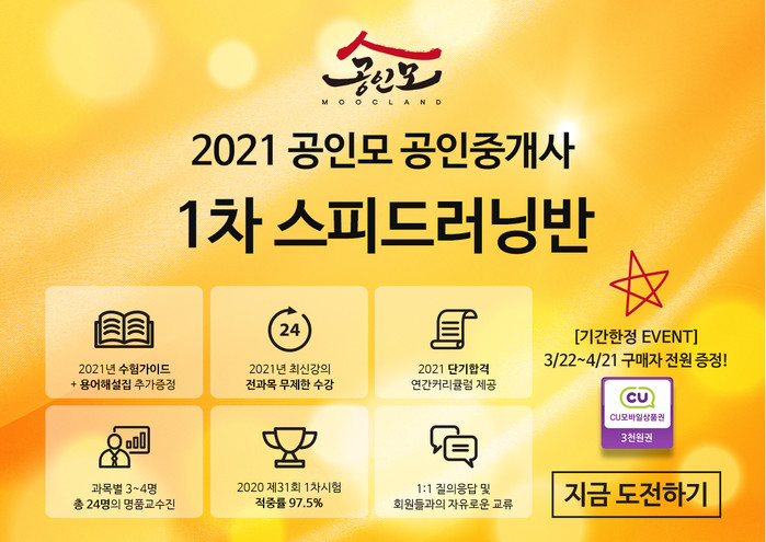공인모에서 선보인 ‘스피드러닝반’ 패키지는 1차, 2차 구매자 전원에게 학습 로드맵과 수험가이드, 커리큘럼 등을 제공한다. 또한 4월 21일까지 구매한 구매자에 한해 CU 모바일 상품권을 증정하는 이벤트를 진행한다.