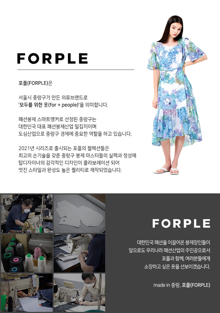 구에 따르면 ‘모두를 위한 옷(for+people)’이란 의미의 ‘포플(FORPLE)’은 구의 대표산업인 패션봉제업을 활성화하고자 지난해 론칭한 브랜드로, 지역 내 봉제공장과 톱 디자이너가 협업해 기획, 생산, 판매하고 있다.