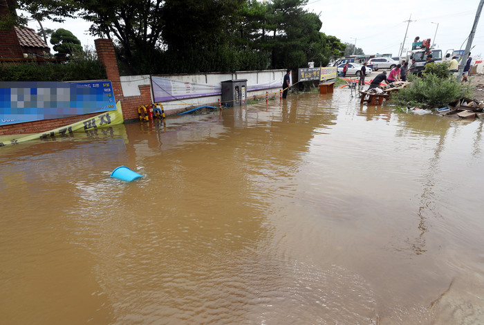 중부지역에 역대 최장기간의 장마가 이어지는 가운데 11일 오후 집중호우로 침수된 인천 중구 을왕동 한 골목에 파란색 양동이가 떠 다니고 있다.