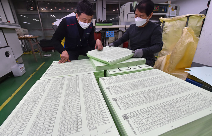 6일 오전 경기도 수원시의 한 인쇄소에서 직원들이 제21대 국회의원선거 투표용지를 인쇄하고 있다.