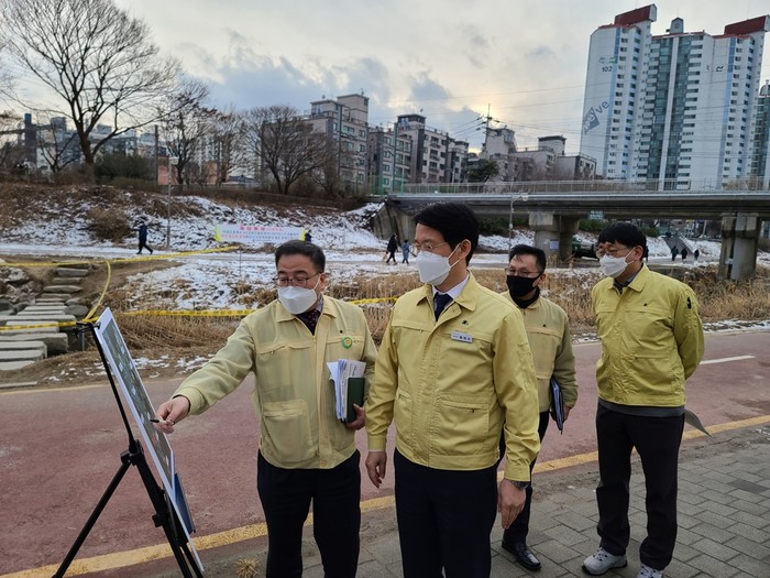 황범순 경기 의정부시 부시장이 최근 호원동 백석천에 위치한 조류독감 인플루엔자(AI) 검출지역을 방문해 방역 상황을 점검했다. 이날 황 부시장은 방역 활동에 총력대응을 주문하고, 상황 점검과 근무자들을 격려하며 철저한 소독과 통제를 당부했다. 사진은 황 부시장(왼쪽 두 번째)이 관계자로부터 현장 상황을 설명 듣고 있는 모습. (사진제공=의정부시청)