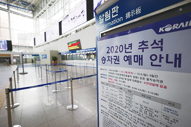 1일 오전 서울역에 신종 코로나바이러스 감염증(코로나19) 확산 예방을 위해 추석 명절 승차권 예매를 100% 비대면인 온라인 및 전화로 사전 판매한다는 안내문이 놓여있다.
