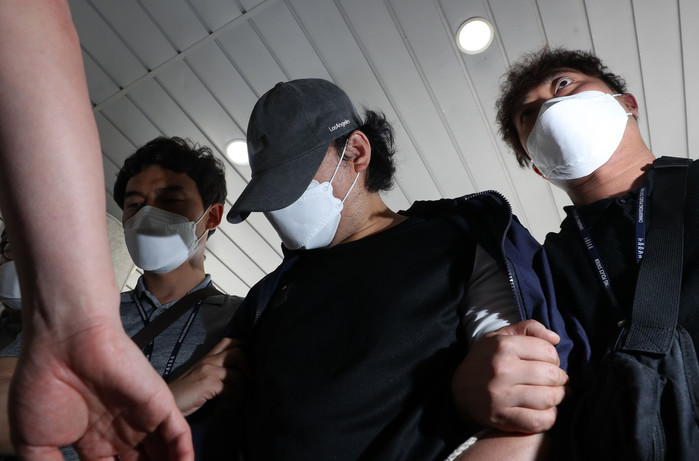 창녕 아동학대 계부(모자 착용)가 15일 오전 영장실질심사(구속 전 피의자 심문)를 받기 위해 창원지방법원 밀양지원으로 이동하며 취재진 질문에 답하고 있다. 이 계부는 자신의 의붓딸을 쇠사슬 등으로 학대한 혐의를 받는다.
