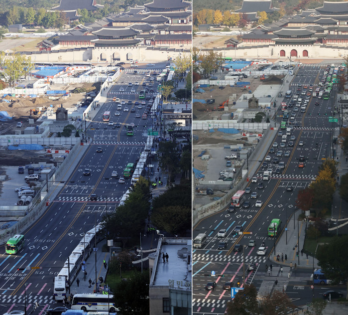 서울시가 1일 광화문광장 등 도심 주요 광장에 적용했던 집회 금지 등 사용 제한을 약 1년 9개월 만에 해제했다. 정부의 단계적 일상회복(위드 코로나) 계획이 이날부터 시행된 데 따른 조치다. 왼쪽 사진은 지난 10월20일 차벽이 설치된 광화문 광장. 오른쪽 사진은 2일 오전 광화문광장의 모습.