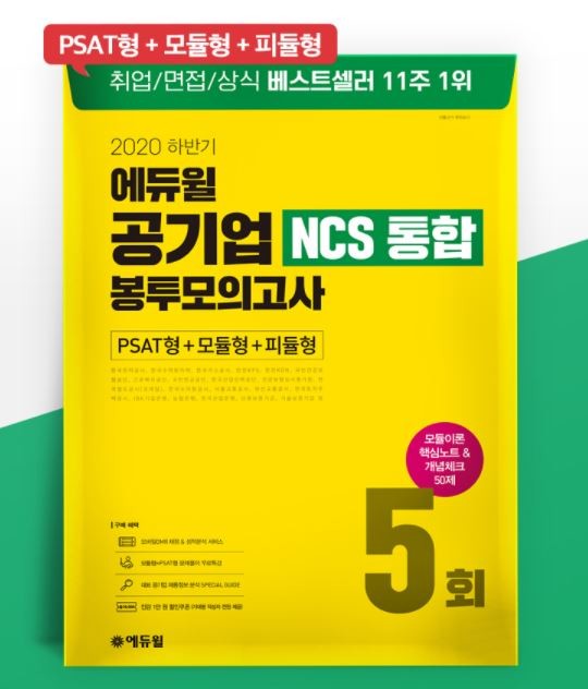 ‘2020 하반기 에듀윌 공기업 NCS 통합 봉투모의고사 5회’ 수험서는 주요 공기업, 공사 공단 NCS 최신 출제 경향을 반영한 PSAT형 모의고사 2회, 모듈형 모의고사 2회, 피듈형 모의고사 1회 총 5회로 구성됐다.