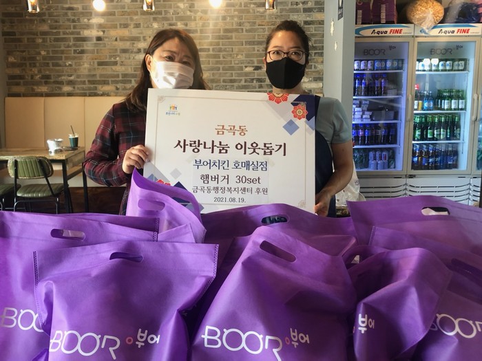 경기 수원시 권선구 금곡동은 19일 부어치킨 호매실점으로부터 취약계층 아동을 위해 햄버거세트 30인분을 후원받았다. 후원받은 간식은 금곡동 행정복지센터에서 비대면 방식으로 대상 아동의 집 앞 문고리에 전달하고 전화을 통해 안부를 확인했다. 사진은 전달식에서 관계자들이 기념촬영을 하는 모습. (사진제공=권선구청)