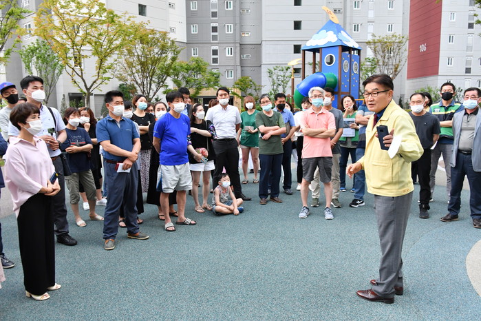 김일권 양산시장이 악취, 소음, 교통 등으로 주거환경 불편을 호소하고 있는 신설 아파트를 방문해 입주민들의 고충을 듣고 함께 해결방안을 모색하는 소통의 자리를 마련했다.