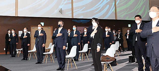 문재인 대통령이 18일 오전 인천 연수구 송도캠퍼스에서 열린 바이오산업 행사에 앞서 국기에 경례하고 있다.