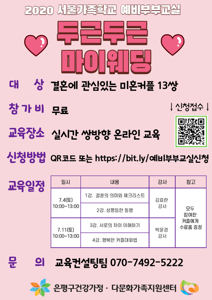 [시민일보 = 이대우 기자] 은평구(구청장 김미경) 건강가정·다문화가족지원센터가 지역내 예비부부 및 미혼커플을 대상으로 오는 7월4·11일 오전 10시~오후 1시 온라인 교육 ‘두근두근 마이웨딩’을 진행한다.