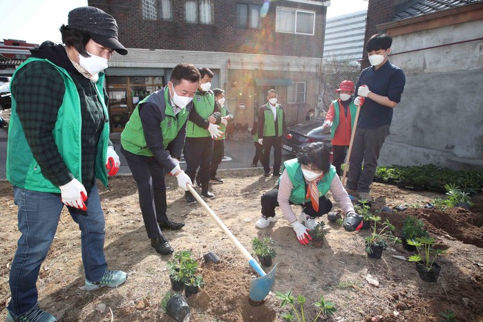 인천 동구 송림1동은 통장자율회 주관으로 17일 송림1동 지역내 유휴지에 봄맞이 봄꽃 심기 행사를 개최했다. 사진은 이날 행사에 참여한 허인환 구청장(왼쪽 두 번째)이 꽃을 심기 위해 땅을 파고 있는 모습. (사진제공=동구청)