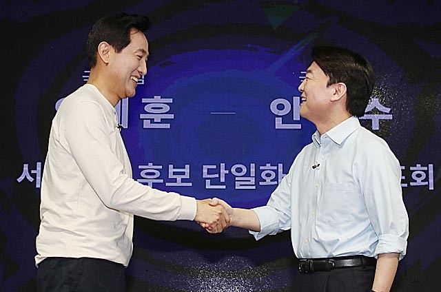 국민의힘 오세훈 서울시장 후보와 국민의당 안철수 서울시장 후보가 15일 서울 영등포 더플러스 스튜디오에서 열린 단일화 비전발표회에 앞서 포토타임을 갖고 있다.