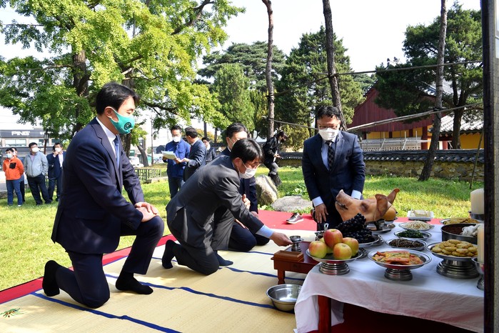 경기 하남시 춘궁동 제3기 신도시 교산주민대책위원회가 지난 12일 광주향교에서 토지보상 감정평가 고유제(告由祭)를 봉행했다. 사진은 이날 행사에 참석한 김상호 시장(왼쪽)과 관계자들이 제사를 지내고 있는 모습. (사진제공=하남시청)