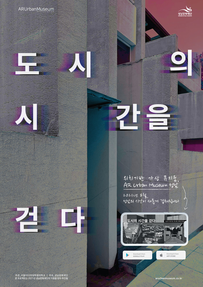 ‘도시의 시간을 걷다’라는 콘셉트로 진행한 이번 프로젝트는 70년대 광주대단지부터 90년대 분당, 2000년대 판교, 2010년대 위례까지 국가 주도의 도시개발정책으로 탄생한 성남의 역사와 문화적 의미를 7명의 참여 작가와 함께 인문학과 예술적 관점에서 재해석한다. 재단은 성남의 과거, 현재, 미래를 상징하는 장소로 광주대단지 시절의 이야기를 간직한 태평 2·4동 일대와 사람과 이야기가 모이는 소통의 장인 모란시장, 성남이 지향하는 도시의 미래상을 보여주는 분당주택전람회단지(퓨쳐힐)를 각각 선정하고 문헌 및 현장 조사 등의 연구와 증강현실 콘텐츠 작업을 진행해왔다.