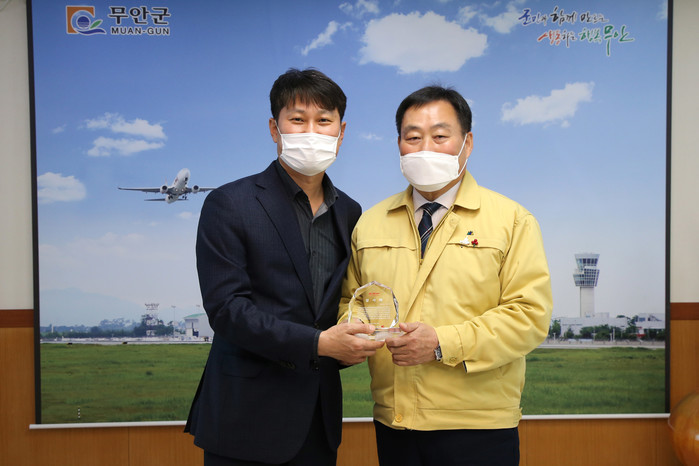 김산 무안군수(오른쪽)는 지난 1일 군청 군수실에서 편리한 항공교통서비스 제공에 기여한 공로로 제주항공 이철행 대외협력본부장(왼쪽)으로부터 감사패를 전달받았다