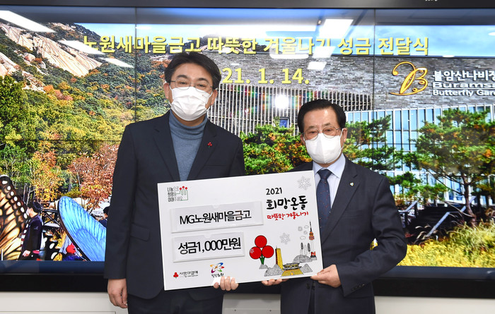 서울 노원구는 14일 노원새마을금고로부터 2021 희망온돌 따뜻한 겨울나기 사업과 관련해 성금 1000만원을 전달받았다. 성금은 지역내 저소득계층에 생계비·의료비 주거비 등으로 지원할 예정이다. 사진은 전달식에서 오승록 구청장(왼쪽)이 관계자와 기념촬영을 하고 있는 모습. (사진제공=노원구청)