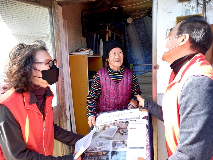 경기 하남시 풍산동행정복지센터와 지역사회보장협의체는 최근 ‘더(The) 행복한 풍산, 독거어르신 꽃샘추위나기 사업’을 진행해 지역내 홀몸노인 20가구를 찾아 고급 전기요를 전달하고 안부를 살폈다. 사진은 협의체 위원들이 홀몸노인에게 전기요를 전달하며 대화를 나누고 있는 모습. (사진제공=하남시청)