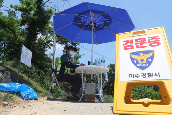 16일 경기 파주시 접경지역에서 경찰이 대북전단 살포를 막기 위해 검문소를 운영하고 있다.