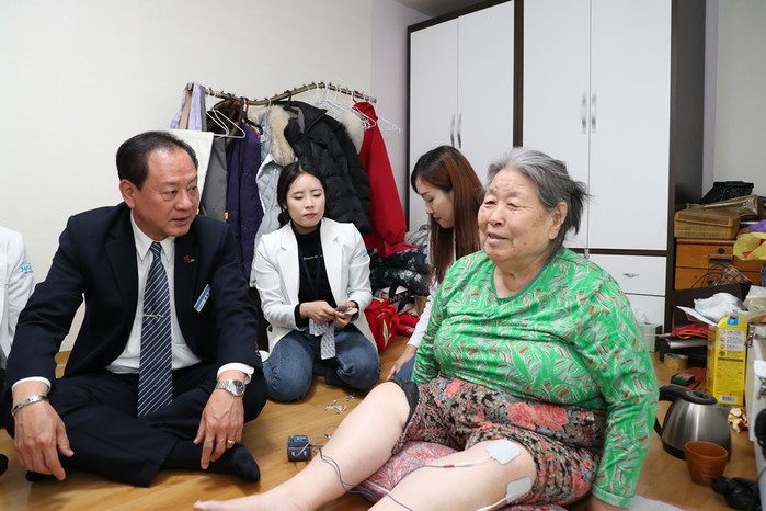 3일 유동균 서울 마포구청장이 구 보건소 건강돌봄팀과 함께 도화동에 거주하는 건강돌봄 대상자 손종분씨(80)의 집을 직접 방문해 맞춤형 보건의료 서비스를 제공했다. 사진은 유 구청장(왼쪽)이 노인과 대화를 나누는 모습. (사진제공=마포구청)