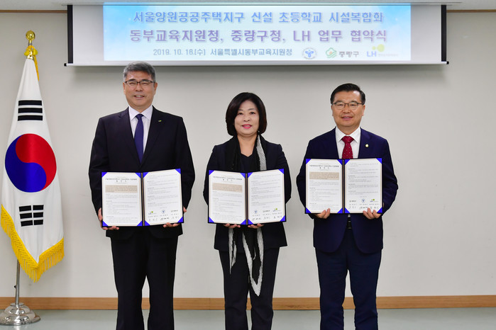 서울 중랑구는 16일 동부교육지원청에서 동부교육지원청, 한국토지주택공사(LH공사)와 서울양원공공주택지구내 초등학교 설립 및 어린이돌봄센터 설치를 위한 업무협약(MOU)을 체결했다. 사진은 협약식에 참석한 류경기 구청장(맨 오른쪽)이 협약서를 들고 기념촬영을 하는 모습. (사진제공=중랑구청)