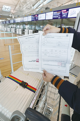 11일 오후 인천국제공항 1터미널 출국장 중국 선전행 항공기 체크인카운터에서 승객들이 코로나19에 걸리지 않았다는 것을 증명하는 음성확인서를 두 장을 준비하고 있다.