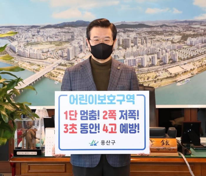 성장현 서울 용산구청장이 15일 구청장실에서 '어린이 교통안전 릴레이 챌린지'에 동참했다. 이번 캠페인은 어린이 보호구역내 교통안전 실천문화 정착과 교통사고 예방을 위한 범국민적인 공감대 형성을 위한 것이다. 사진은 성 구청장은 ‘1단 멈춤, 2쪽 저쪽, 3초 동안, 4고 예방’이라고 쓴 피켓을 들고 포즈를 하고 있는 모습. (사진제공=용산구청)