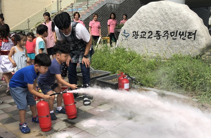 경기 수원시 영통구는 22일 시립광교2동어린이집 교사 및 어린이 약 70명을 대상으로 '체험식 화재대피훈련'을 실시했다. 사진은 훈련에 참여한 어린이들이 직접 소화기로 불을 끄는 체험을 하는 모습.(사진제공=영통구청)