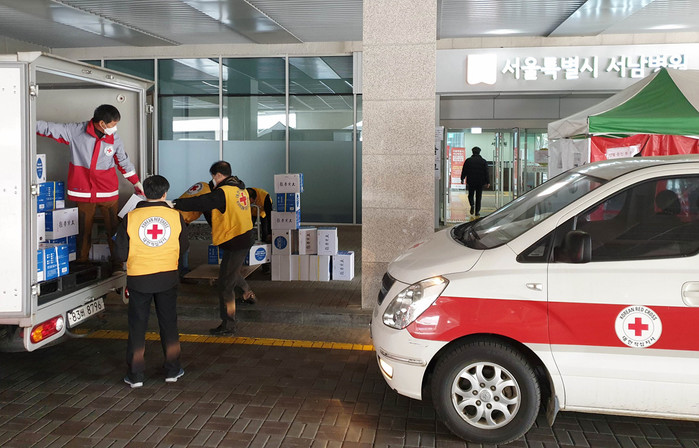 대한적십자사 서울시지사가 지난 21일 국가지정 전담병원 및 국가지정 입원치료병상 의료진들에게 마스크, 방호복, 의료용 장갑으로 구성된 '의료진 지원세트'를 지원했다. 적십자 서울지사는 서울의료원, 서남병원, 보라매병원, 국립중앙의료원, 서북병원 및 서울대학교병원에 마스크 3만720장, 방호복 1300개, 의료용 장갑 13만켤레를 전달했다. 사진은 관계자들이 지원세트를 전달하고 있는 모습. (사진제공=대한적십자사 서울시지사)