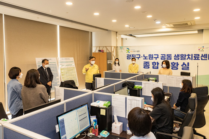 김선갑 서울 광진구청장이 14일 코로나19 확진 구민을 위한 광진구·노원구 공동 생활치료센터를 방문해 운영 현황을 살펴보고, 근무자들을 격려했다. 사진은 김선갑 구청장(가운데)이 생활치료센터를 방문해 근무자들을 격려하고 있는 모습. (사진제공=광진구청)