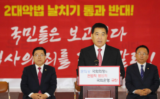 자유한국당 심재철 원내대표가 25일 국회 로텐더홀에서 열린 원내대표-최고중진연석회의에서 발언하고 있다. /연합뉴스