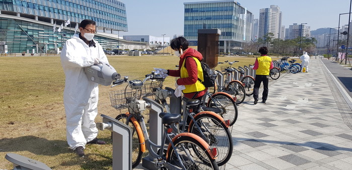 세종시 보람동 주민자치위원회를 비롯한 지역내 직능단체 회원 20여명이 10일 코로나19 지역사회 확산을 방지하기 위해 지역내 버스정류장, 공공자전거, 어린이놀이터 등을 중심으로 마을방역 봉사활동을 펼쳤다. 사진은 공공자전거를 소독하는 모습. (사진제공=세종시청)