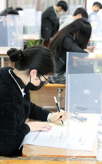2021학년도 대학수학능력시험(12월 3일)을 앞두고 대구지역 고3 수험생들의 마지막 학력평가가 실시된 18일 오전 대구중앙고등학교 3학년 교실에서 수험생들이 시험에 집중하고 있다.