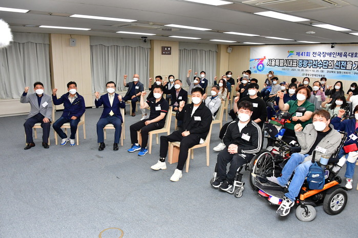 중랑구는 14일 경상북도 일원에서 오는 20~25일 열리는 전국장애인체육대회에 참가하는 중랑구선수단을 격려하는 자리를 마련했다. 중랑구선수단 39명은 서울시 대표로 17개 종목에 참가한다. 사진은 이날 류경기 구청장(왼쪽 세 번째)과 선수단이 함께 '파이팅'을 외치는 모습. (사진제공=중랑구청)