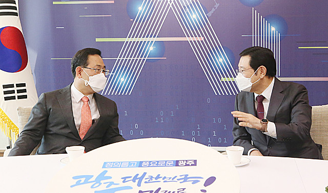 27일 오전 광주 서구 광주시청 접견실에서 국민의힘 주호영(왼쪽) 원내대표와 이용섭 광주시장이 예산정책협의회를 시작하기 전 환담하고 있다.
